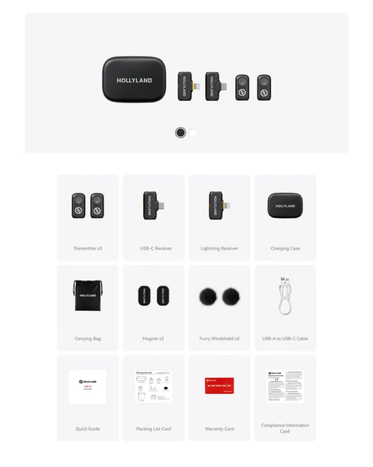 HollyLand Lark A1 Combo คือชุดไมโครโฟนไร้สายสำหรับสมาร์ทโฟนที่รวมเอาคุณภาพเสียงระดับสตูดิโอไว้ในดีไซน์กะทัดรัด พร้อมดีไซน์พรีเมียมให้เลือกถึง 2 สี – สี Space Gray สำหรับลุคเรียบหรู และสี Ivory White สำหรับสาย Minimal ที่ต้องการความโดดเด่นแบบคลีนๆ ใช้งานได้กับทั้ง iPhone และ Android (ตามรุ่นที่เลือก)